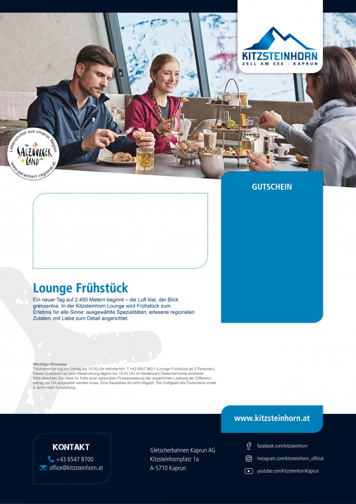 Dieser Warengutschein ist nach Reservierung täglich bis 10:45 Uhr im Restaurant Gletschermühle einlösbar. Bitte beachten Sie, dass im Falle einer saisonalen Preisanpassung der angeführten Leistung der Differenzbetrag vor Ort aufgezahlt werden muss. Eine Barablöse ist nicht möglich. Die Gültigkeit des Gutscheins endet 5 Jahre nach Ausstellung.